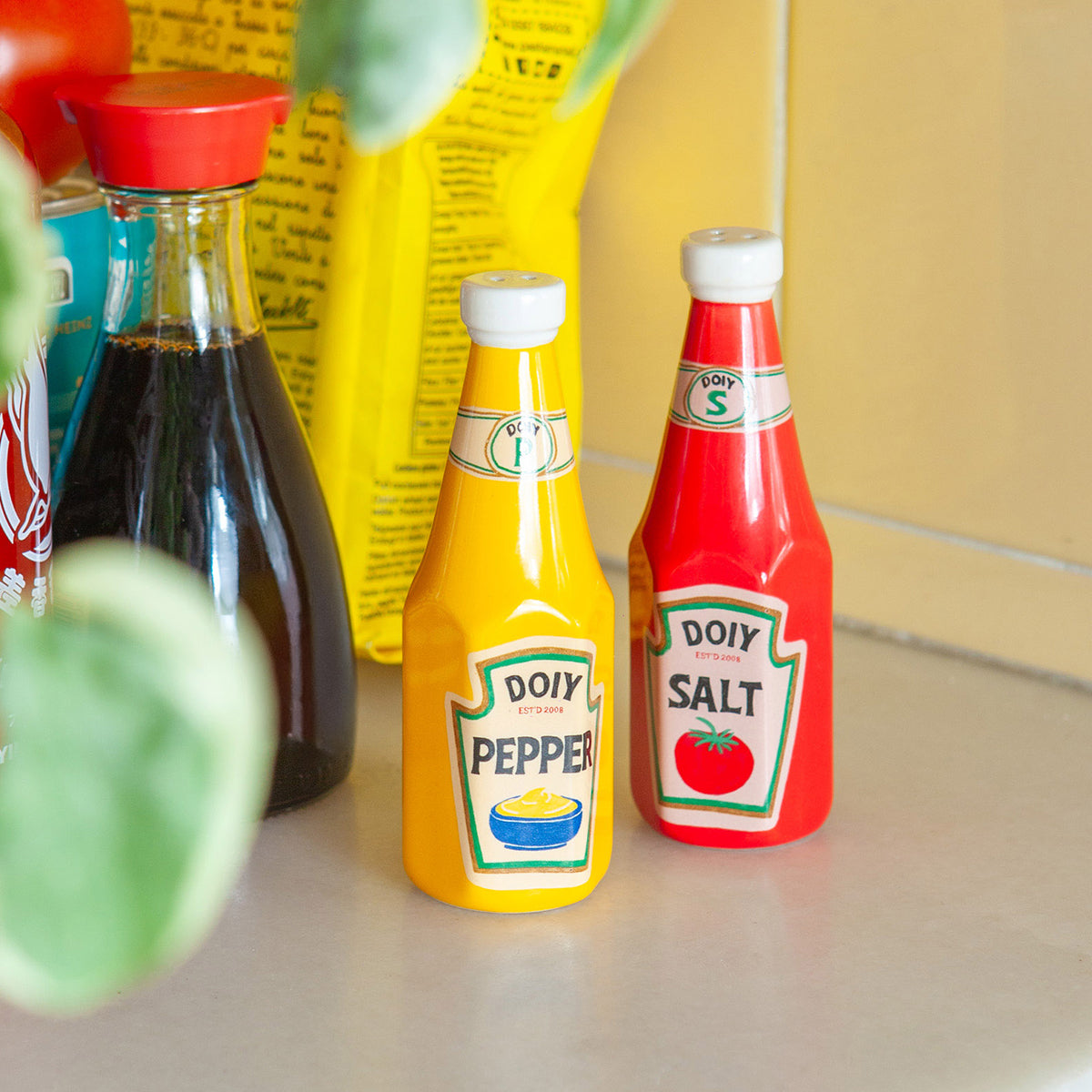 Ceramic salt and pepper shakers shaped as ketchup and mustard bottles.