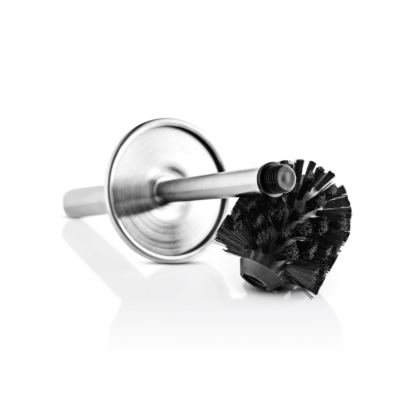 The toilet brush is equipped with a replaceable brush head made from recycled plastic.