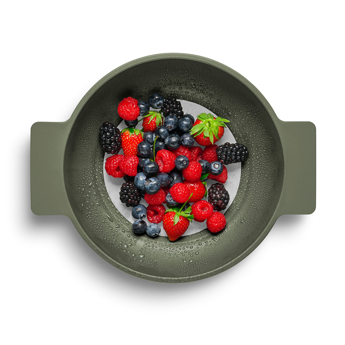 - The strainer stands stably on four feet and has two practical handles.